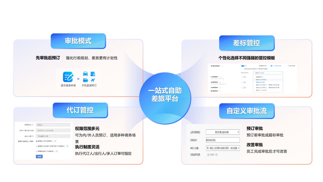 商旅服云平臺提供一站式的解決方案,幫助企業(yè)規(guī)范管理,提升大家的差旅出行體驗。將差旅制度配置到系統(tǒng)中就能實現(xiàn)差旅標(biāo)準(zhǔn)的差異化管理,實現(xiàn)事前、事中、事后全方位監(jiān)管。