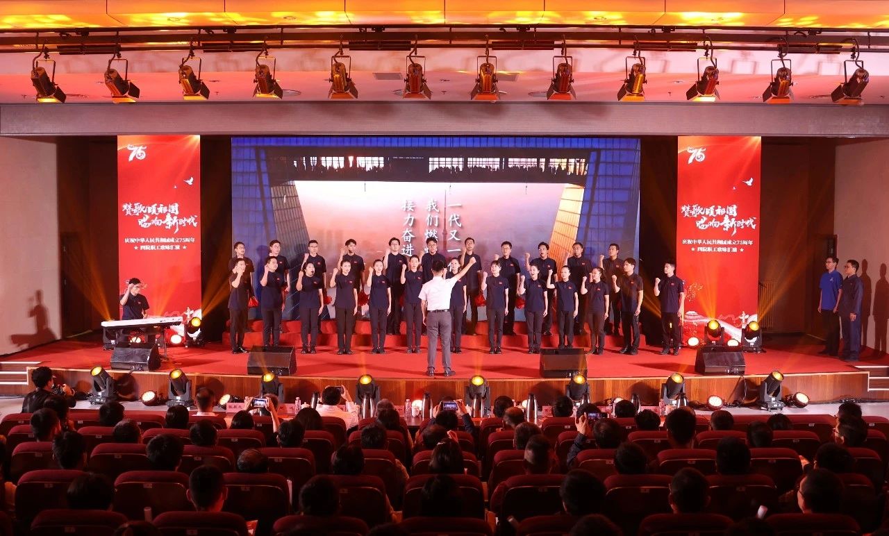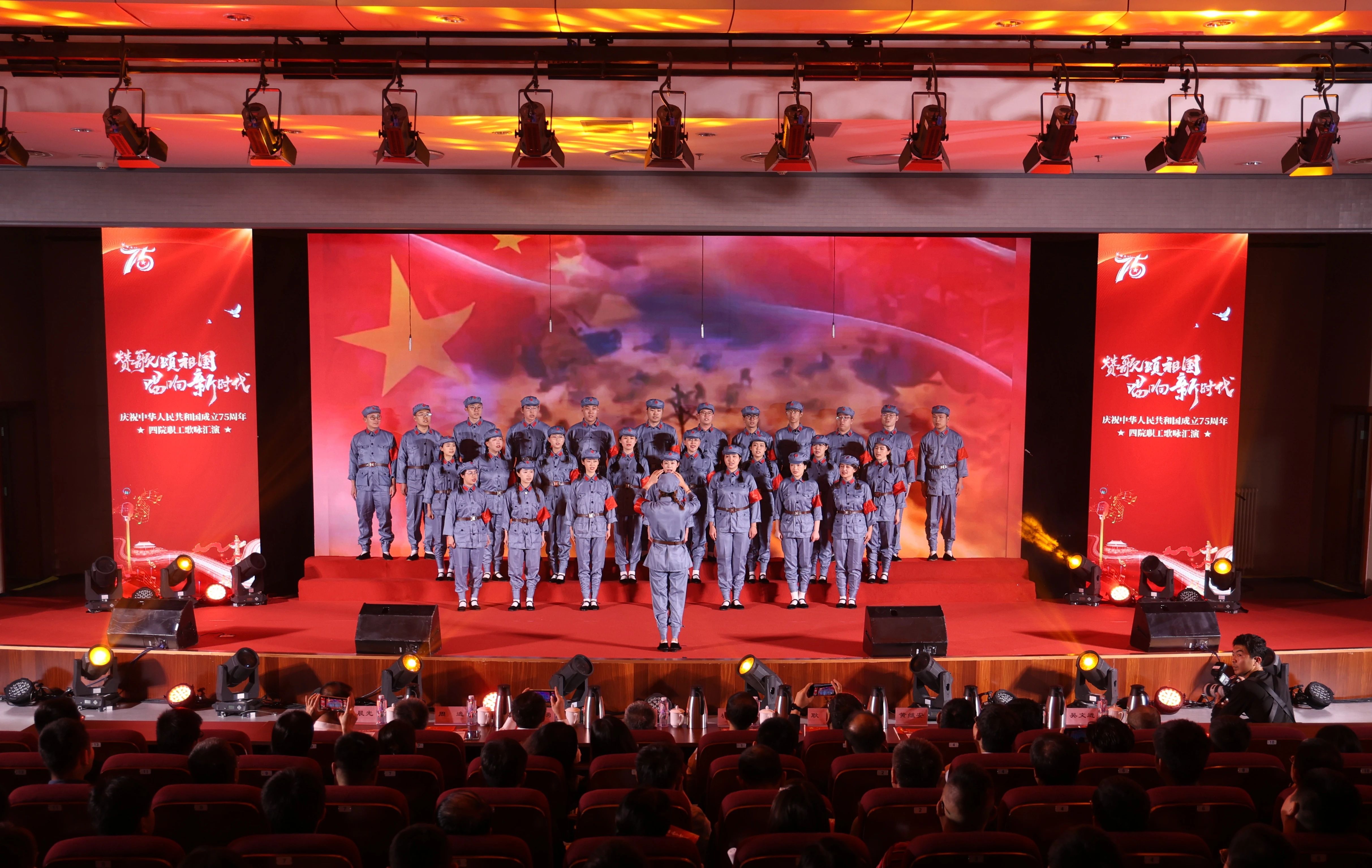 為熱烈慶祝中華人民共和國成立75周年,激發(fā)干部職工愛黨愛國熱情,9月28日,四院舉辦了“贊歌頌祖國 唱響新時代”主題職工歌詠匯演活動。四院全體在家領導班子出席活動并與參演全體職工大合唱。