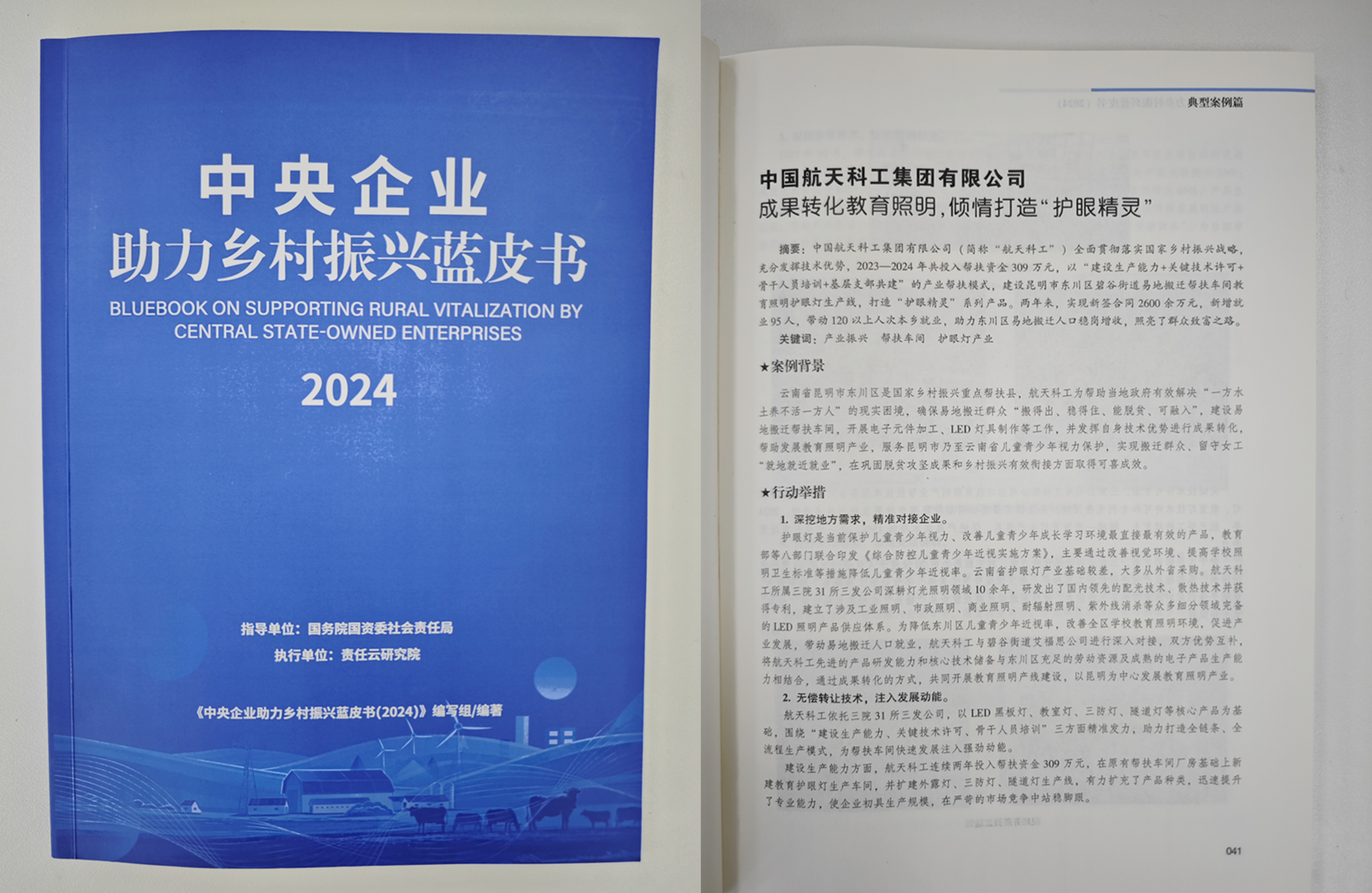 國務(wù)院國資委同步發(fā)布了《中央企業(yè)助力鄉(xiāng)村振興藍(lán)皮書(2024)》,集團(tuán)公司《成果轉(zhuǎn)化教育照明,傾情打造“護(hù)眼精靈”》案例入選。該案例中,集團(tuán)公司充分發(fā)揮技術(shù)優(yōu)勢(shì),以“建設(shè)生產(chǎn)能力+關(guān)鍵技術(shù)許可+骨干人員培訓(xùn)+基層黨支部共建”的產(chǎn)業(yè)幫扶模式,建成昆明市東川區(qū)碧谷街道易地搬遷幫扶車間教育照明護(hù)眼燈產(chǎn)線,打造“護(hù)眼精靈”系列產(chǎn)品。兩年來,實(shí)現(xiàn)新簽合同2600余萬元,新增就業(yè)95人,帶動(dòng)120以上人次本鄉(xiāng)就業(yè),助力實(shí)現(xiàn)東川區(qū)易地搬遷人口穩(wěn)崗增收,照亮了群眾致富之路。本項(xiàng)目是集團(tuán)公司堅(jiān)持“地方所需、航天所能”,促進(jìn)幫扶地區(qū)產(chǎn)業(yè)發(fā)展,實(shí)現(xiàn)特色產(chǎn)業(yè)跨區(qū)域轉(zhuǎn)移的示范案例。