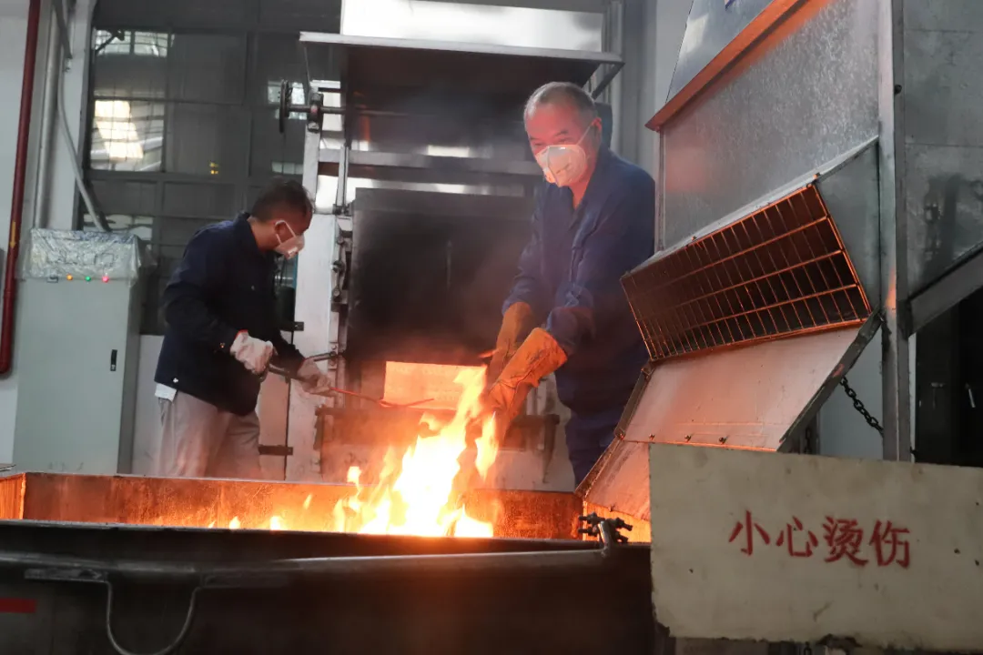 夏日炎炎,紅峰公司精密制造事業(yè)部車間一片火紅,特種工藝組組員們正對零件進(jìn)行熱處理。熱處理是中間工序,時間節(jié)點(diǎn)緊,要求隨叫隨到,組員們接到任務(wù)馬上行動,將零件放入超過1000℃的真空淬火爐加熱后取出?,F(xiàn)場作業(yè)溫度超過40℃,他們的臉被烤得通紅,衣服濕透。(圖文/羅曼)