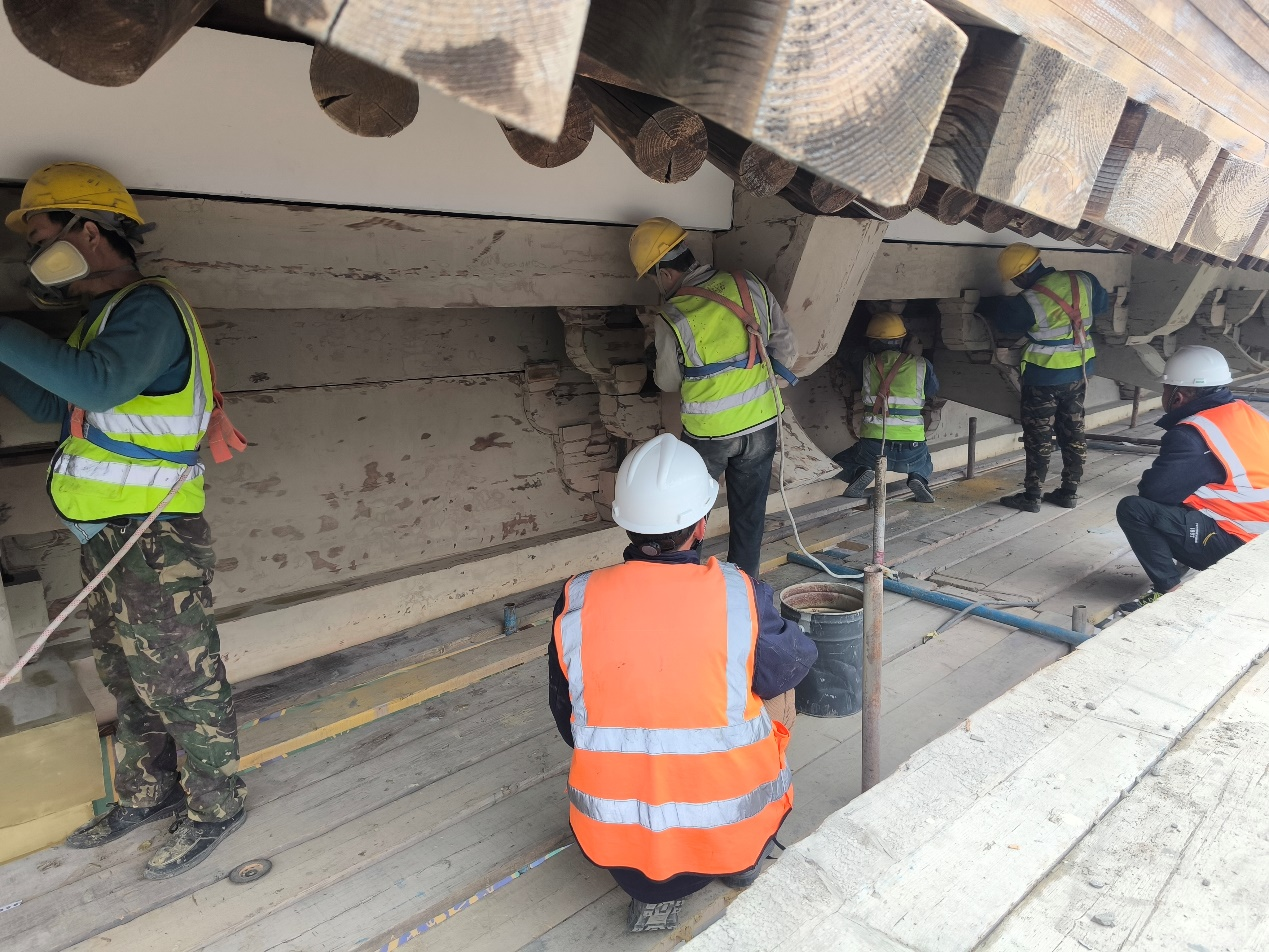 為保證項目實施進(jìn)度,晨光藝術(shù)工程哈爾濱藥師寶殿維修項目的工作人員放棄與家人團(tuán)聚的機(jī)會,堅守在自己的工作崗位上,他們穿梭在施工現(xiàn)場,進(jìn)行斗拱打磨和墻體彩繪,一絲不茍地打磨,一筆一劃地描繪,在古建筑修復(fù)的現(xiàn)場,航天晨光人用自己的雙手和汗水保障項目按期推進(jìn)。
