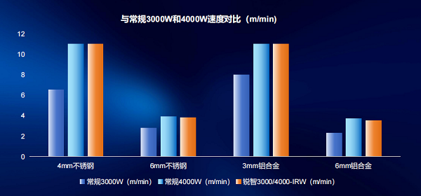在工藝實測方面,對比常規(guī)3000W激光器,銳智系列3000/4000-IRW平均速度提升超40%,其中在6mm鋁合金提升可達52%;對比常規(guī)4000W,銳智系列3000/4000-IRW與之薄板切割速度基本持平。