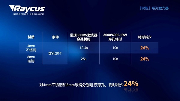 使用常規(guī)3000W激光器和銳智系列3000/4000-IRW激光器分別對4mm不銹鋼和8mm碳鋼進行穿孔,其中常規(guī)3000W激光器穿孔耗時分別為12.4s和25s,3000/4000-IRW激光器穿孔耗時分別為10s和19s,耗時均減少24%。