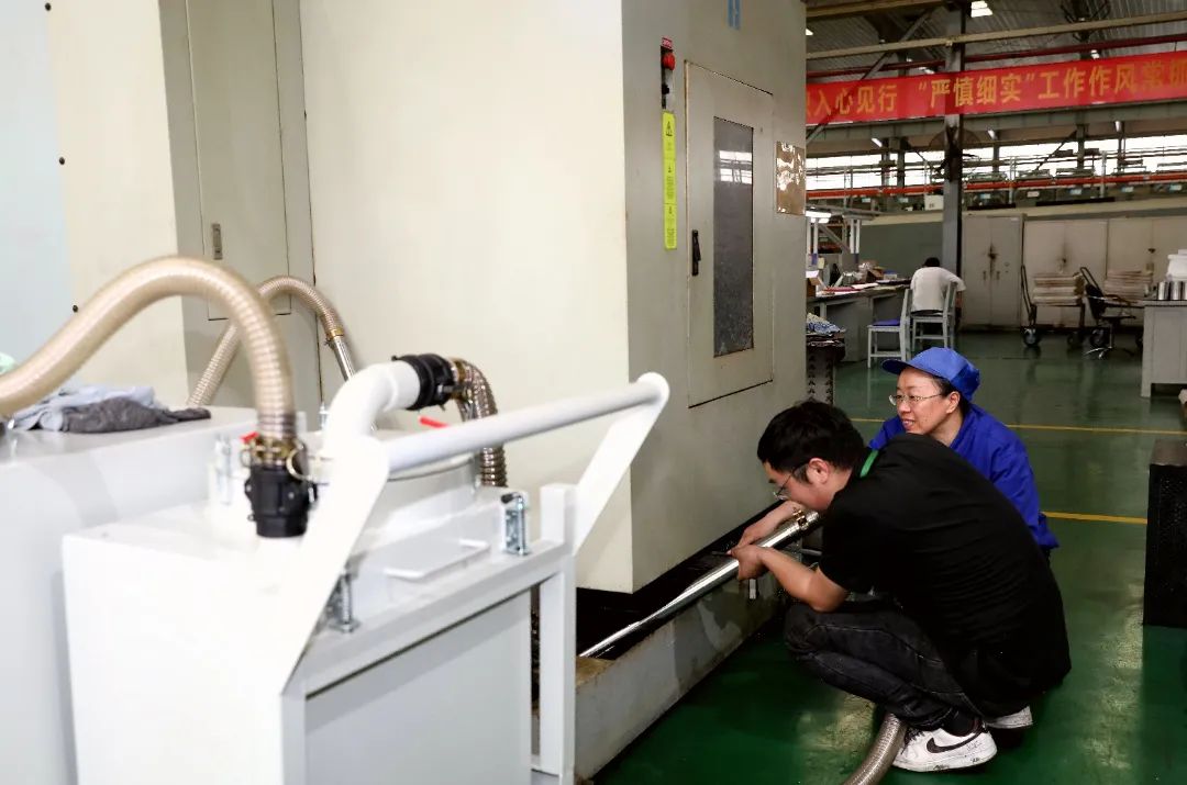 在大廳的另一側,車工小楊正認真地跟設備廠家人員學習清洗機床切削液。數(shù)控機床作為生產(chǎn)的關鍵設備,其運行狀態(tài)直接影響生產(chǎn)節(jié)奏。為確保其健康,該公司不惜投入重金,購置清洗機和凈化機,有效解決了設備維護保養(yǎng)耗時耗力、清理不徹底的難題。