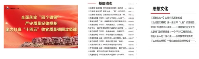 院屬各單位制作航天科工質(zhì)量日電視墻,在北京各工業(yè)區(qū)和成都分中心各科研場(chǎng)所同步播放;組織開展質(zhì)量案例分享;以匠心守初心,積極開展質(zhì)量信得過班組、質(zhì)量標(biāo)兵等質(zhì)量先進(jìn)事例和人物宣傳,同時(shí)基于內(nèi)部網(wǎng)站、宣傳欄等多種渠道進(jìn)行廣泛宣傳,弘揚(yáng)優(yōu)秀航天質(zhì)量文化。