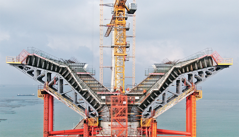 中央企業(yè)把主題教育與貫徹中央重大決策部署結(jié)合起來,切實抓好服務(wù)構(gòu)建新發(fā)展格局戰(zhàn)略任務(wù)。黃茅??绾Mǖ朗抢^港珠澳大橋、深中通道之后,粵港澳大灣區(qū)又一跨海通道工程,由保利長大承建的黃茅海大橋中塔于2023年4月18日順利封頂。圖為4月17日,工人在黃茅海跨海通道黃茅海大橋進(jìn)行墩柱基樁建設(shè)。 新華社記者 鄧華/攝