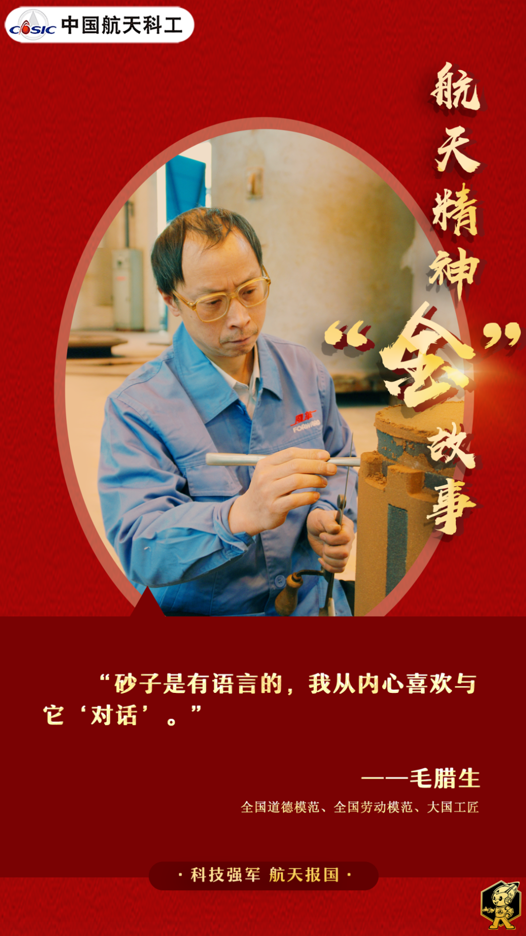 航天江南集團(tuán)有限公司所屬航天風(fēng)華公司的鑄造工人、全國(guó)道德模范毛臘生,秉持一顆匠心,堅(jiān)守一份執(zhí)著,40多年扎根一線與砂子“對(duì)話”,書寫新時(shí)代航天技能工人的敬業(yè)奉獻(xiàn)篇章。
