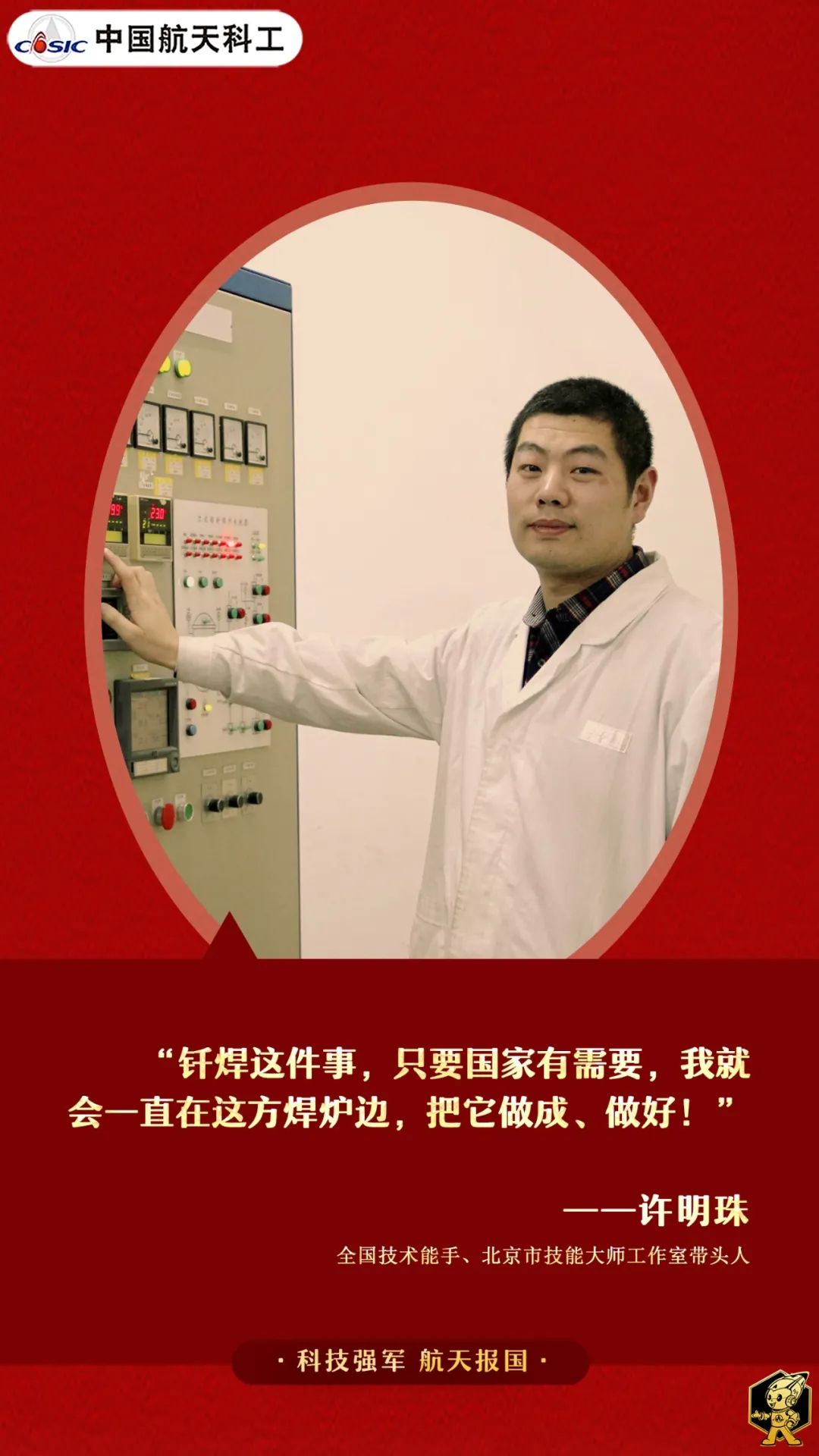 “國家有需要,我一定要做成、做好。”這是許明珠從業(yè)24年踐行的諾言,也是他對工匠精神的生動詮釋。從少年到匠人,從學(xué)徒到大師,許明珠用執(zhí)著和堅韌打造釬焊產(chǎn)品,他深諳釬焊之道:將自己的青春“熔”進工藝并化身為最好的釬料,與祖國航天事業(yè)緊緊焊在一起。