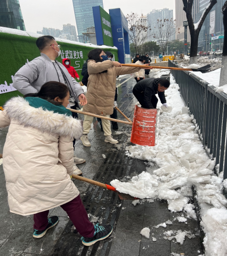 近日,武漢出現(xiàn)寒潮、低溫雨夾雪等冰凍天氣,道路積雪濕滑,給市民出行帶來了極大不便。為有效應(yīng)對(duì)雨雪冰凍天氣,全力保障道路暢通和群眾出行安全,中國(guó)航天科工財(cái)務(wù)公司武漢分公司黨支部積極組織黨員和志愿者參加了由廣發(fā)銀行大廈黨委和北湖街道共同組織開展的“微光成炬 益匯江漢”掃雪除冰志愿服務(wù)。