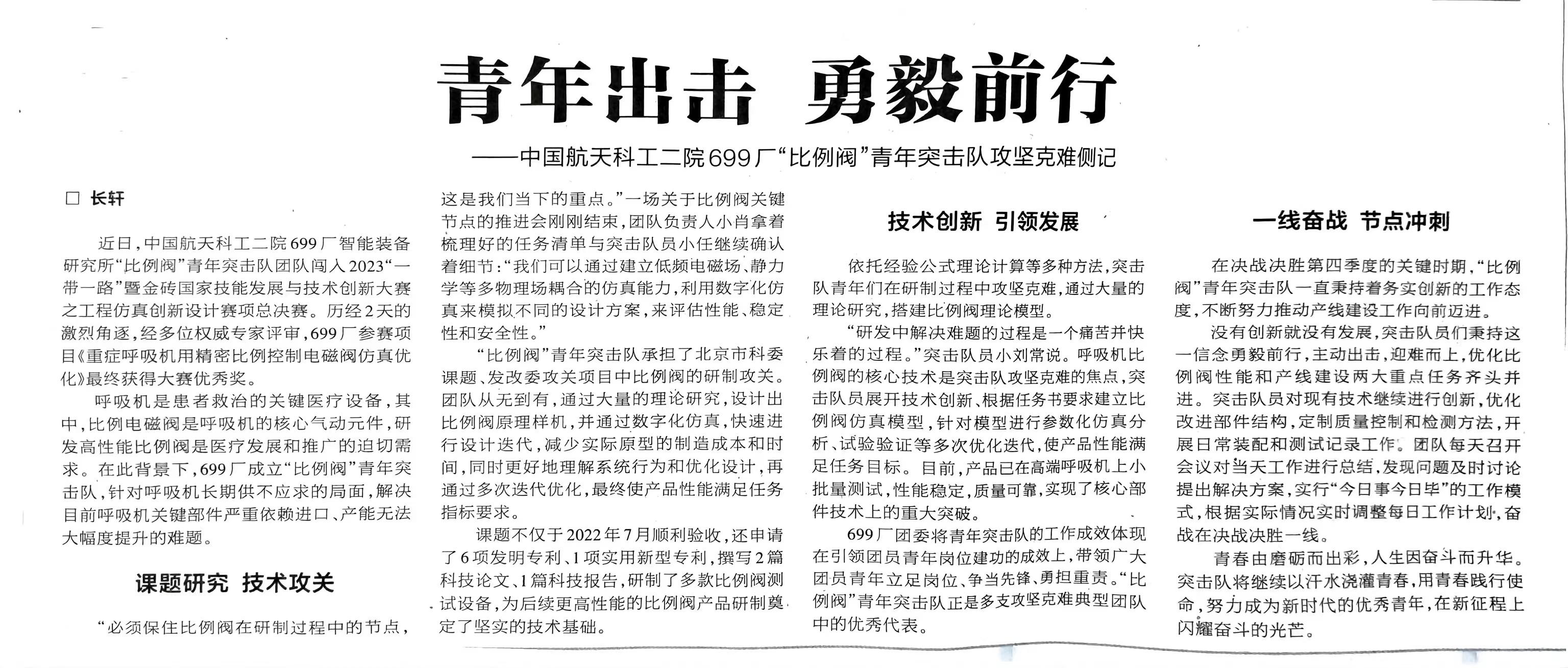 在全年科研生產(chǎn)工作中,青年突擊隊成績斐然。在全院一盤棋精神感召下,迅雷青年突擊隊大力協(xié)同,勠力力同心、努力拼搏,加班加點,僅用4天完成兄弟單位某設(shè)備生產(chǎn)調(diào)試任務(wù),為兄弟單位在空間特殊環(huán)境中試驗提供了有力保障;二齊青年突擊隊在承接任務(wù)過程中積極創(chuàng)新,自制工裝,研究新方法,新技術(shù),使得技術(shù)方法有了新的突破,拓寬了699廠承接任務(wù)廣度;加油桿青年突擊隊為了全力保障總體在試驗場調(diào)試進度,將調(diào)試任務(wù)模塊化分配,并責任到人、節(jié)點到天,成功配合總體完成聯(lián)調(diào);“極限沖鋒”青年突擊隊杜絕“差不多”,追求“零缺陷”,認真梳理產(chǎn)品狀態(tài),做好工藝審查,提早發(fā)現(xiàn)問題,留出解決問題的時間,提前消除質(zhì)量隱患,為一流質(zhì)量保駕護航;“創(chuàng)新創(chuàng)效”青年突擊隊在保障生產(chǎn)任務(wù)同時,年度突破性承接15項課題研究工作,編制和修訂標準7項,特殊過程確認9項;翱翔青年突擊隊致力于科研創(chuàng)新,依托型號任務(wù)積極開展工藝攻關(guān)與工藝細化量化工作,通過創(chuàng)新手段實現(xiàn)精細化管理,獲得2023年中國創(chuàng)新方法大賽北京賽區(qū)二等獎;“比例閥”青年突擊隊獲2023一帶一路暨金磚國家技能發(fā)展與技術(shù)創(chuàng)新大賽優(yōu)秀獎。青年突擊隊始終用青年合力為企業(yè)科研生產(chǎn)任務(wù)的高質(zhì)量完成作出了堅強的保障。
