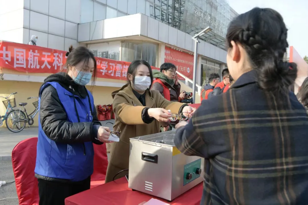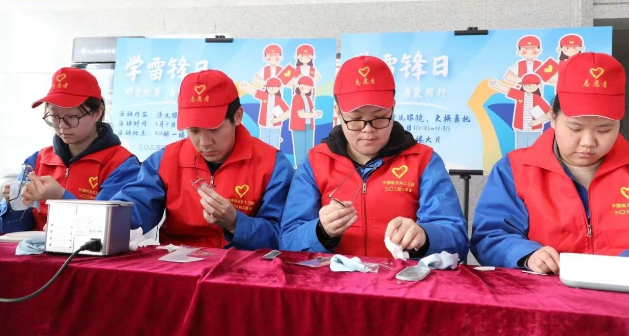 ▲303所團(tuán)委舉辦了“明亮視界 與愛同行”志愿服務(wù)活動,為所內(nèi)職工提供更換鼻托和超聲波清洗眼鏡服務(wù)。