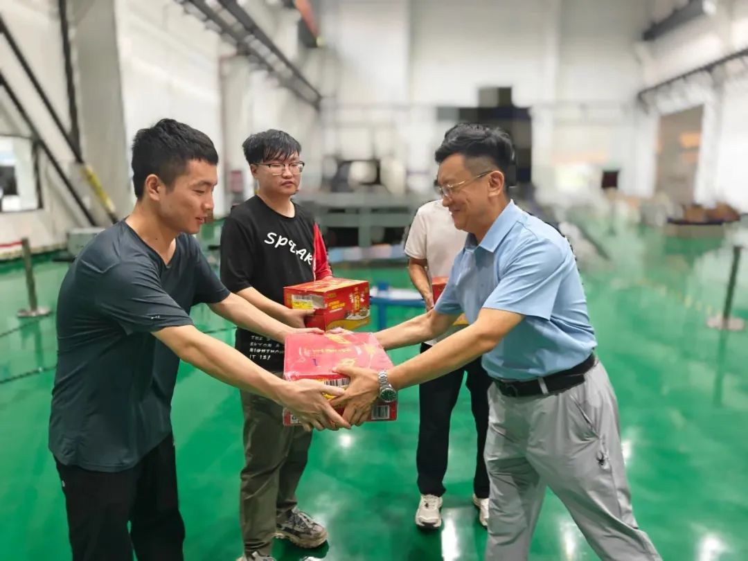 近日,火箭公司開(kāi)展“夏日送清涼”慰問(wèn)活動(dòng),為奮戰(zhàn)在一線的職工送去清涼飲品、防暑物資,并提醒大家注意勞逸結(jié)合,做好防護(hù),確保安全生產(chǎn)。(圖/張煒梓 文/段淑婧)