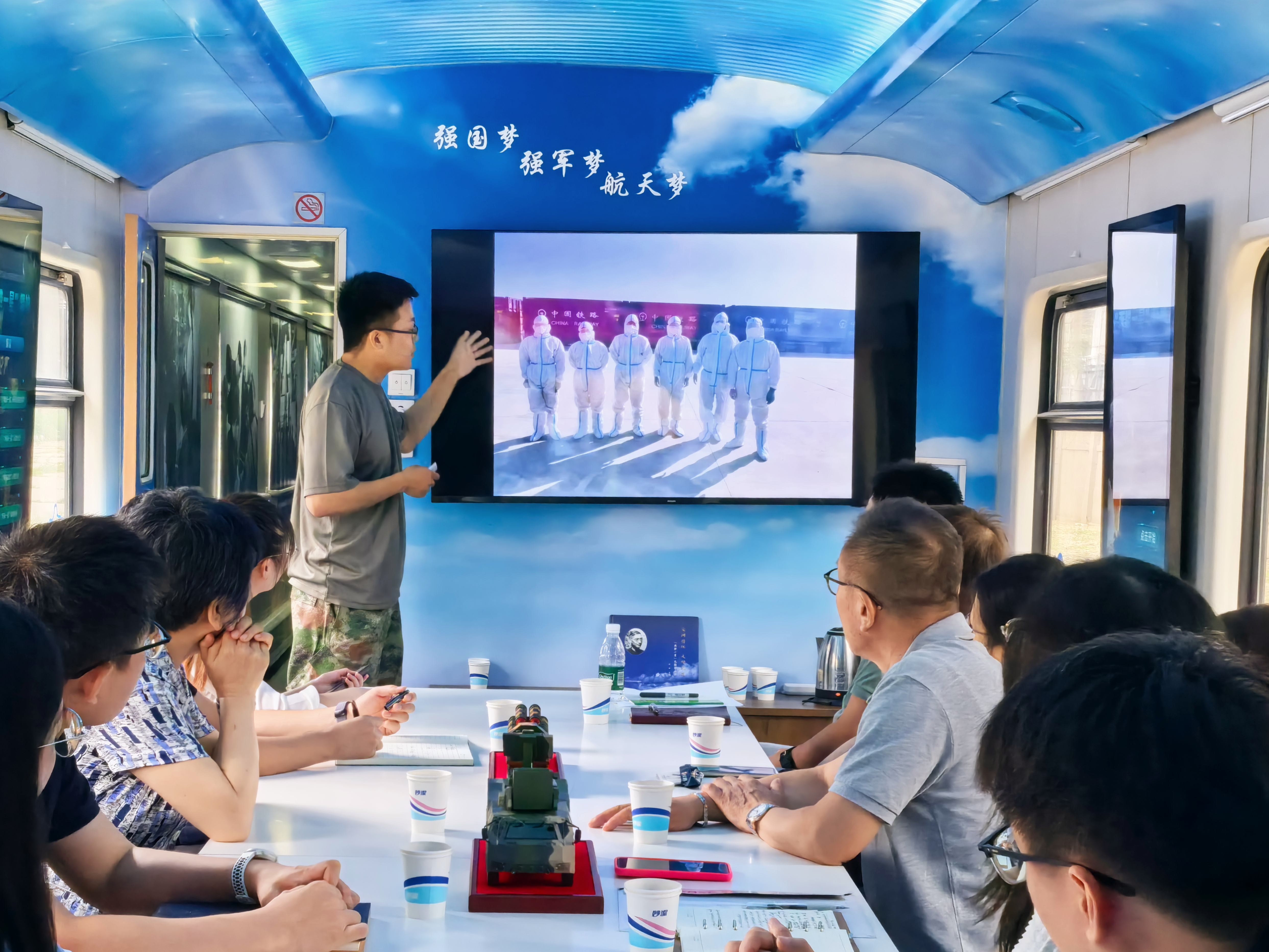 活動(dòng)伊始,大家踏上“紅藍(lán)專(zhuān)列”。這是中天鵬宇公司以自營(yíng)多年、奔波馳騁在轉(zhuǎn)運(yùn)戰(zhàn)線上的鐵路自備車(chē)為載體而建成的數(shù)字化黨建文化移動(dòng)陣地和“兩彈一星”精神傳播陣地。在“紅色專(zhuān)列”上,大家依次參觀了“初心學(xué)堂”“偉大歷程”和“航天報(bào)國(guó)”三個(gè)展區(qū),通過(guò)數(shù)字化顯示屏和展板載體、全景式噴繪和實(shí)物布展,沉浸式感受偉大的建黨精神,體悟蘊(yùn)含其中的信仰力量、精神力量和傳承力量;在“藍(lán)色專(zhuān)列”上,大家通過(guò)參觀“功勛引領(lǐng)”“筑夢(mèng)之路”“歷史光影”“精神傳承”和“互動(dòng)問(wèn)答”五個(gè)板塊,“瞻其人、觀其程、學(xué)其神、聽(tīng)其聲、覺(jué)其思”,深入感悟“兩彈一星”精神的深刻內(nèi)涵和時(shí)代價(jià)值。